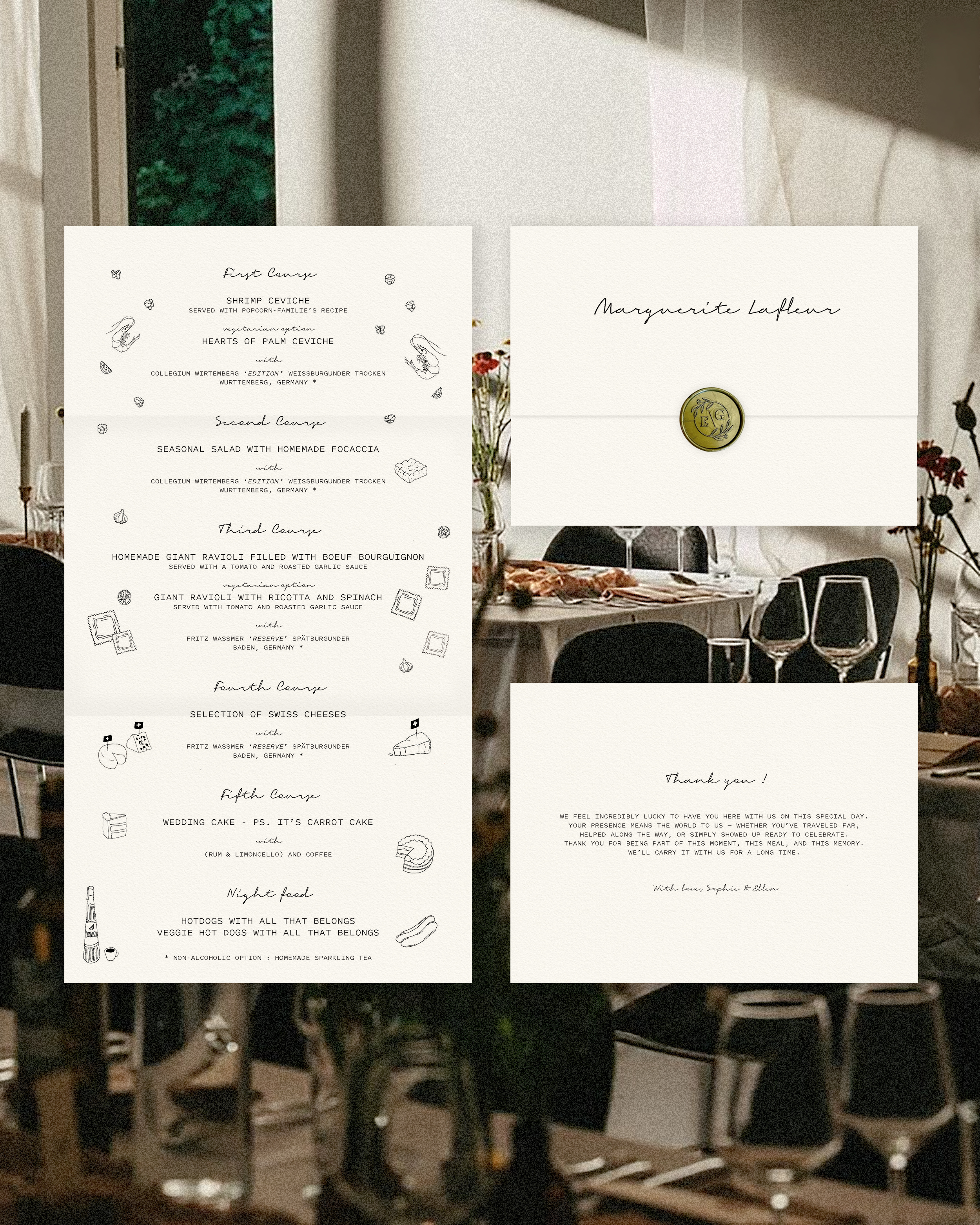 Pour le mariage de Sophie et Ellen, j’ai imaginé une papeterie simple et chic, ponctuée de touches ludiques et de mouvement.