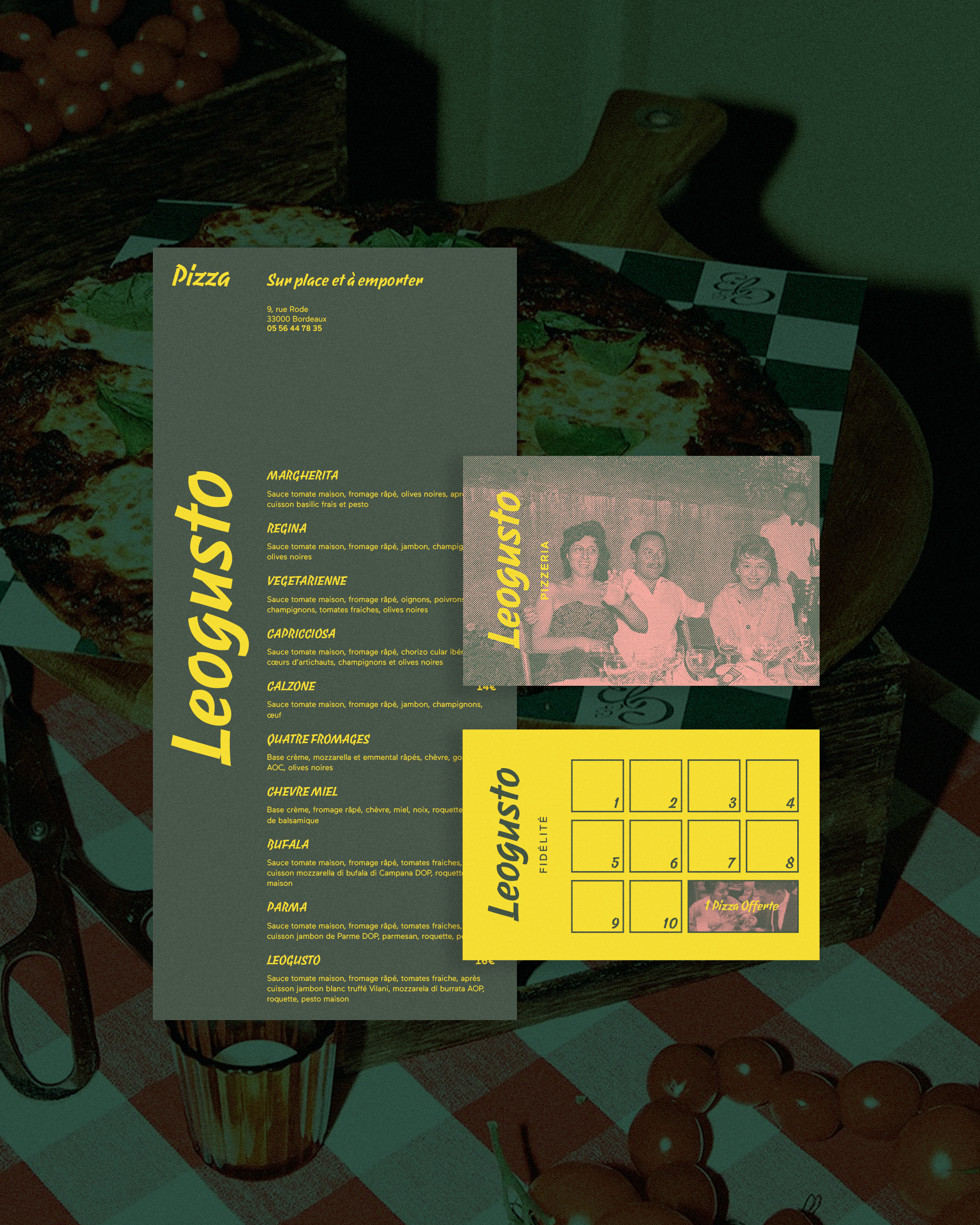 Leogusto est une pizzeria bordelaise dont l’identité visuelle puise dans l’imaginaire des anciennes affiches de cinéma italien, souvenirs d’enfance de Paolo, aujourd’hui transmis à son fils Léo. Des scènes emblématiques, réunies autour d’une cuisine simple et généreuse, dessinent un univers graphique chaleureux, célébrant le partage, la convivialité et l’héritage familial. ︎︎︎